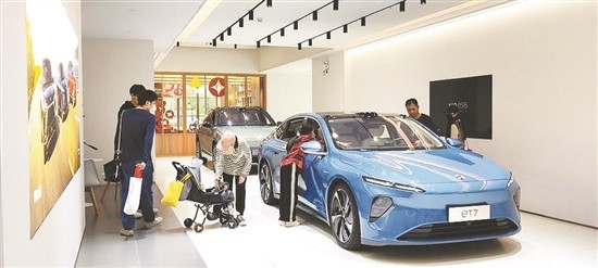 某蔚來(lái)空間體驗(yàn)店內(nèi),購(gòu)車者正在體驗(yàn)新車