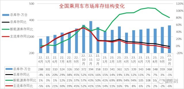 根據(jù)乘聯(lián)會(huì)的數(shù)據(jù),2023年10月月末全國(guó)乘用車(chē)庫(kù)存368萬(wàn)臺(tái),其中廠家?guī)齑?4萬(wàn)臺(tái),渠道庫(kù)存294萬(wàn)臺(tái),廠家?guī)齑嬲急?0.1%,較2022年10月下降1.9個(gè)百分點(diǎn),環(huán)比上月下降0.4個(gè)百分點(diǎn)。