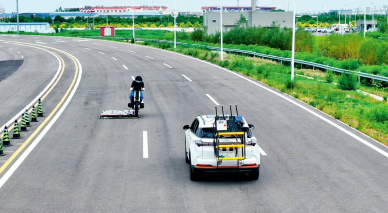 測試車輛在天津(西青)國家級車聯(lián)網(wǎng)先導區(qū)封閉測試場內進行自動駕駛主動安全功能測試 (2024年6月14日攝) 孫凡越攝