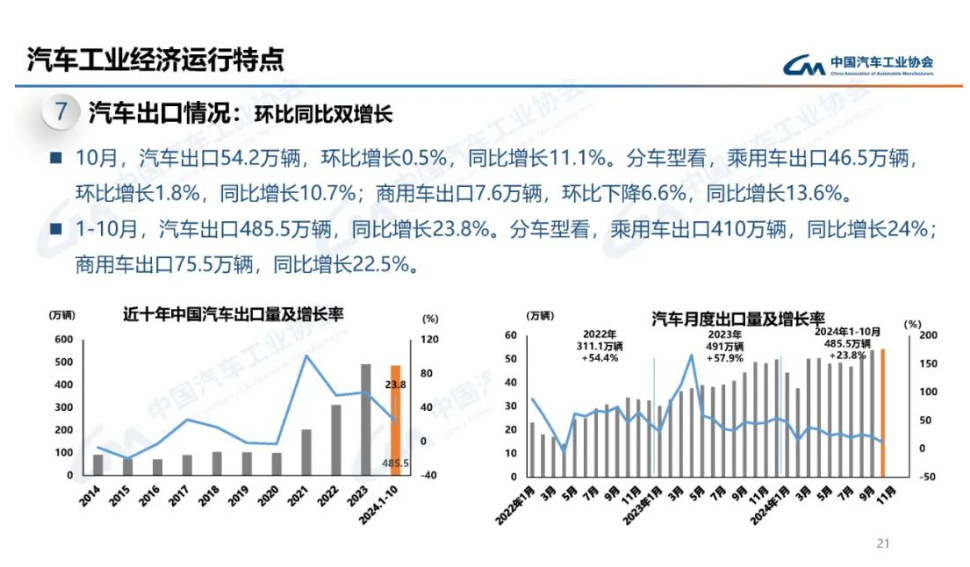 在汽車出口方面,10月,汽車出口 54.2 萬輛,環(huán)比增長 0.5%,同比增長 11.1%。1-10 月,汽車出口 485.5 萬輛,同比增長 23.8%。