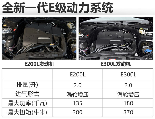 動(dòng)力方面,新車將搭載兩款不同調(diào)校的2.0T渦輪增壓發(fā)動(dòng)機(jī),其中E200L是沿用現(xiàn)款車型上的2.0T發(fā)動(dòng)機(jī),最大功率135千瓦,最大扭計(jì)300牛米;E300L發(fā)動(dòng)機(jī)則擁有更強(qiáng)的動(dòng)力,最大功率180千瓦,最大扭矩達(dá)到370牛米。