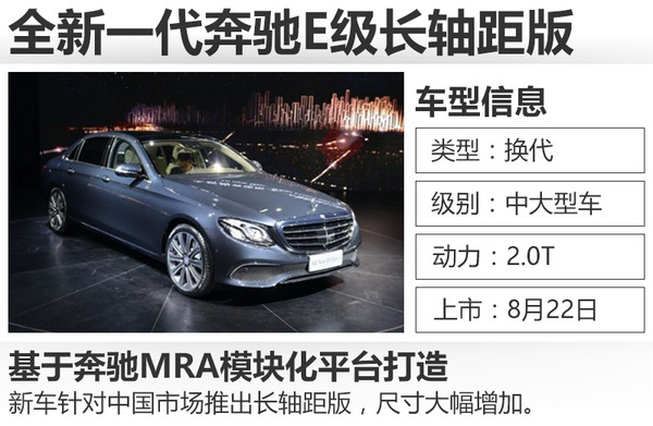 全新一代奔馳E級(jí)長(zhǎng)軸距于上個(gè)月在北京奔馳亦莊工廠正式下線,新車針對(duì)中國(guó)市場(chǎng)的需求進(jìn)行了全面優(yōu)化,從外觀、內(nèi)飾到車身尺寸都有明顯提升。網(wǎng)通社從梅賽德斯-奔馳官方了解到,全新一代奔馳E級(jí)長(zhǎng)軸距版將于8月22日在北京正式上市。新車采用不同調(diào)校的2.0T發(fā)動(dòng)機(jī),并首次搭載9速自動(dòng)變速箱。
