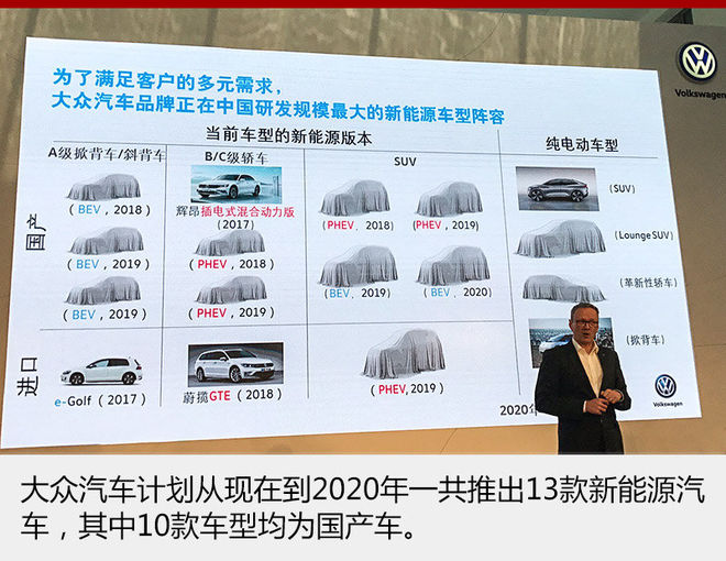 從這張規(guī)劃圖中能夠看到,至2020年大眾汽車在中國新推出13款新能源車,其中有10款車型會在國內(nèi)進(jìn)行本土化生產(chǎn)。加上已上市的e-UP!和高爾夫GTE,大眾在華新能源車陣容將增至15款。另外,進(jìn)口引入的e-Golf和上汽大眾輝昂插電混動版將于年內(nèi)率先投入市場。