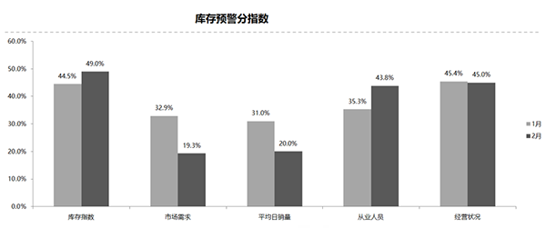從庫存預(yù)警分指數(shù)來看,庫存指數(shù)、從業(yè)人員指數(shù)環(huán)比上升;市場銷量指數(shù)、平均日銷量指數(shù)、經(jīng)營狀況指數(shù)環(huán)比下降。樊宇表示,2月庫存預(yù)警指數(shù)較高,依然位于50%的警戒線之上。同時,因?yàn)槭袌鲂枨蠛推骄珍N量呈明顯下降狀態(tài),經(jīng)銷商面臨較大壓力。
