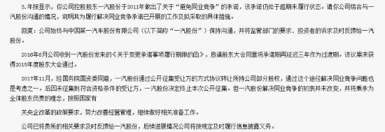 6月28日就要到了,雖然獲準(zhǔn)延遲三年,但解決一汽轎車與一汽夏利間同業(yè)競爭問題的承諾終究還是到了該兌現(xiàn)的時候。 2011年6月,一汽股份成立之初,曾向一汽轎車和一汽夏利作出不可撤銷承諾:在一汽股份成立后五年內(nèi)通過資產(chǎn)重組或其他方式整合所屬的轎車整車生產(chǎn)業(yè)務(wù),以解決同業(yè)競爭問題。但五年過去了,這一問題并未得到解決,在2016年6月28日,一汽轎車和一汽夏利同時發(fā)布公告稱,一汽股份原計劃在五年內(nèi)解決其與子公司一汽轎車、一汽夏利同業(yè)競爭的承諾無法履行,將承諾期再度延遲三年作為過渡期,而上述承諾的截止日期,也就是2019年6月28日。