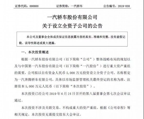一汽轎車股份有限公司關(guān)于設(shè)立全資子公司的公告 6月25日,一汽轎車正式發(fā)布了《一汽轎車股份有限公司關(guān)于設(shè)立全資子公司的公告》,提出“擬以自有資金人民幣5000萬元投資設(shè)立全資子公司”,名稱暫定為“一汽奔騰轎車有限公司”。按照此前發(fā)布的《一汽轎車股份有限公司重大資產(chǎn)置換及發(fā)行股份和可轉(zhuǎn)換債券、支付現(xiàn)金購買資產(chǎn)并募集配套資金暨關(guān)聯(lián)交易預(yù)案》,此次成立的“一汽奔騰轎車有限公司”在接受了一汽轎車的“置出資產(chǎn)”后,其100%股權(quán)將過戶至一汽股份。至此,一汽轎車的主營業(yè)務(wù)將從“乘用車的開發(fā)、制造和銷售”徹底變更為“商用車的開發(fā)、制造和銷售”,與一汽夏利間的同業(yè)競爭問題,即將徹底得到解決。 終于可以松口氣了! 從2011年6月至今,一汽夏利和一汽轎車長達(dá)8年時間的“同業(yè)競爭”困擾,算是暫時可以告一段落。盡管在一汽股份收下奔騰后,仍然存在一汽夏利和其控股股東一汽股份間的同業(yè)競爭問題,但知名證券分析師、全聯(lián)車商投資管理(北京)有限公司總裁曹鶴在接受《中國汽車報》記者采訪時表示,畢竟一汽夏利和一汽股份間不像之前那樣,同為兩大上市公司,因此,解決這一問題的迫切性就沒有這么大了。至少,一汽夏利和一汽轎車不會再因為這個問題受到深交所的問詢。 事實上,6月4日,深交所在向天津一汽夏利汽車股份有限公司發(fā)出的年報問詢函中,除了虧損和股權(quán)交易等情況外,再次提及了同業(yè)競爭問題,要求一汽夏利“結(jié)合與一汽股份溝通的情況,說明其為履行解決同業(yè)競爭承諾已開展的工作及擬采取的具體措施”。對此,一汽夏利的回復(fù)如下。