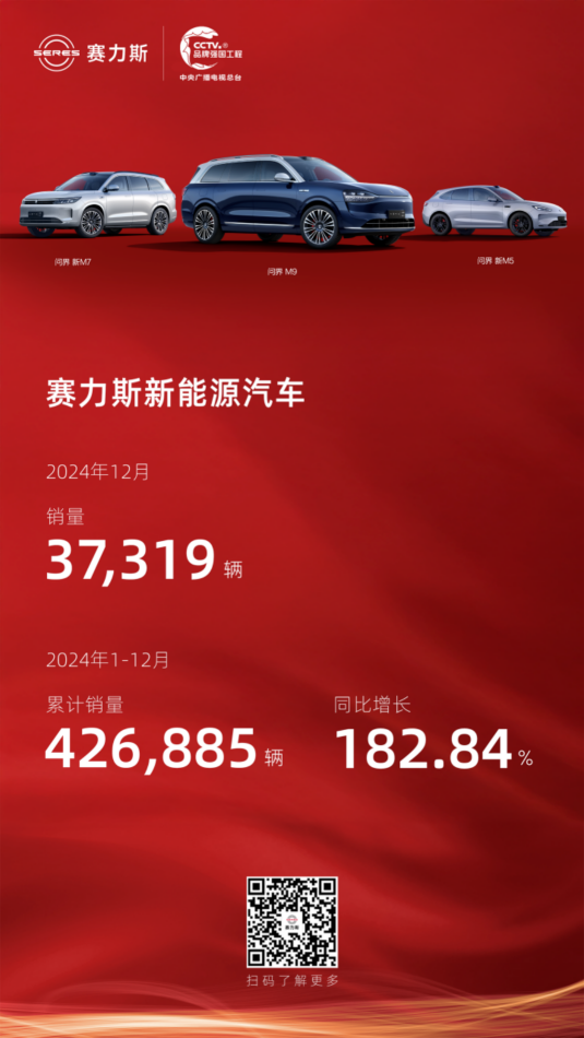 2025年1月1日,賽力斯發(fā)布2024年12月產(chǎn)銷快報(bào)。數(shù)據(jù)顯示,賽力斯12月新能源汽車銷量達(dá)37319輛;1-12月新能源汽車?yán)塾?jì)銷量達(dá)426885輛,同比增長182.84%。