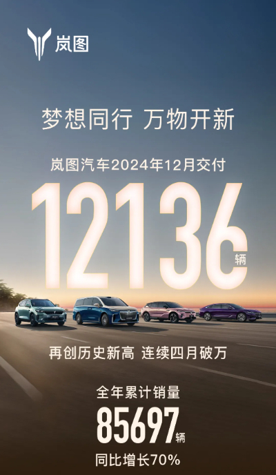 2024年1-12月,嵐圖汽車累計交付85697輛,同比增長70%,迸發(fā)出強勁的增長勢能。不僅如此,銷量實現(xiàn)“八連漲”,連續(xù)四個月躋身“萬輛俱樂部”,且產(chǎn)品市場均價穩(wěn)定在35萬元以上,使得嵐圖成為汽車企業(yè)高質(zhì)量發(fā)展的典型代表。作為用戶型科技企業(yè),嵐圖汽車將高質(zhì)量發(fā)展落實到每一處細節(jié),深度契合新產(chǎn)業(yè)、新業(yè)態(tài)、新模式要求,走出了一條獨具特色且極具示范意義的道路。