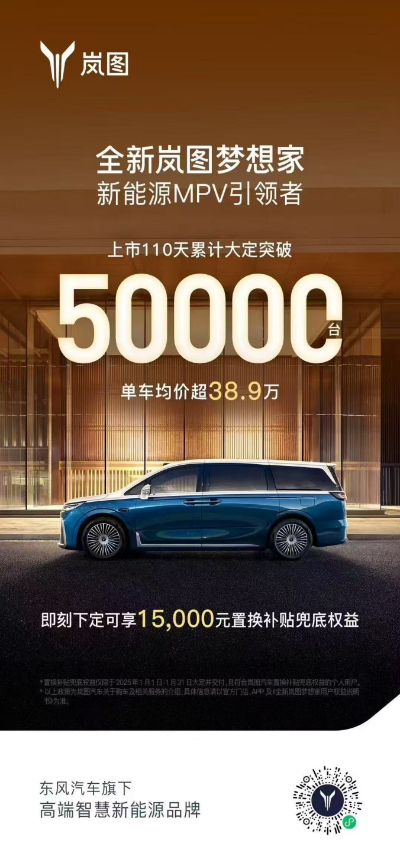 展望未來,嵐圖汽車CEO盧放表示:“2025年將推出4款以上全新或改款車,以更加完善的SUV、轎車和MPV產(chǎn)品布局,進一步滿足廣大用戶的個性化需求。全新嵐圖夢想家將以領(lǐng)先一代的產(chǎn)品力,成為絕對爆款,夯實‘頂流’地位,同時嵐圖繼續(xù)打造更多爆款,全力沖刺全年20萬輛的銷量目標,為更多用戶提供持續(xù)、穩(wěn)定、靠譜的產(chǎn)品和服務?!?/p>