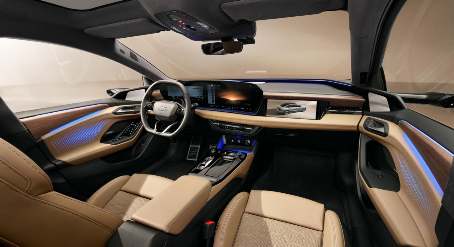 造型設計上,奧迪 A6L e-tron 憑借 0.22Cd 的超低風阻系數,演繹空氣動力學與美學的極致平衡。前臉通過纖細日間行車燈與寬大格柵,營造扁平寬闊視覺;凸起的“quattro blisters”以肌肉感線條彰顯 quattro 驅動屬性,搭配流暢線條,將空氣動力學效率與視覺張力融合,賦予車身蓄勢待發(fā)的力量感。奧迪 A6L e-tron大燈和尾燈采用三維設計,并提供動感數字燈光簽名,創(chuàng)造出物理世界和數字世界交相輝映的智能美感。
