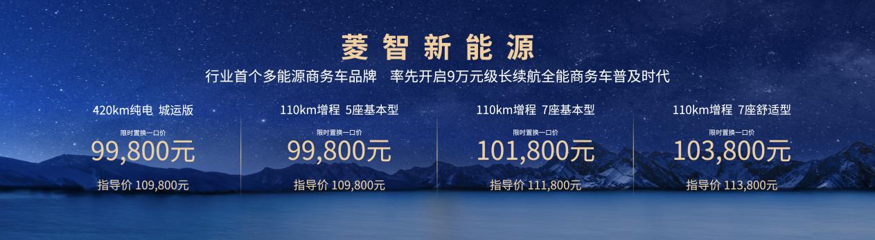 發(fā)布會上,菱智家族正式發(fā)布全新新能源產(chǎn)品矩陣,涵蓋純電、增程雙技術(shù)路線版本。其中,菱智新能源420km純電城運版,售價為10.98萬元,限時置換一口價9.98萬元;菱智新能源110km增程版,售價為10.98-11.38萬元,限時置換一口價9.98-10.38萬元。2025年6月30日前訂車的首批客戶贈送價值1500元的10寸液晶大屏,以及對行駛里程超過10萬公里的車輛,贈送基礎(chǔ)保養(yǎng)1次,助力中小微創(chuàng)業(yè)者跑出“創(chuàng)富加速度”。