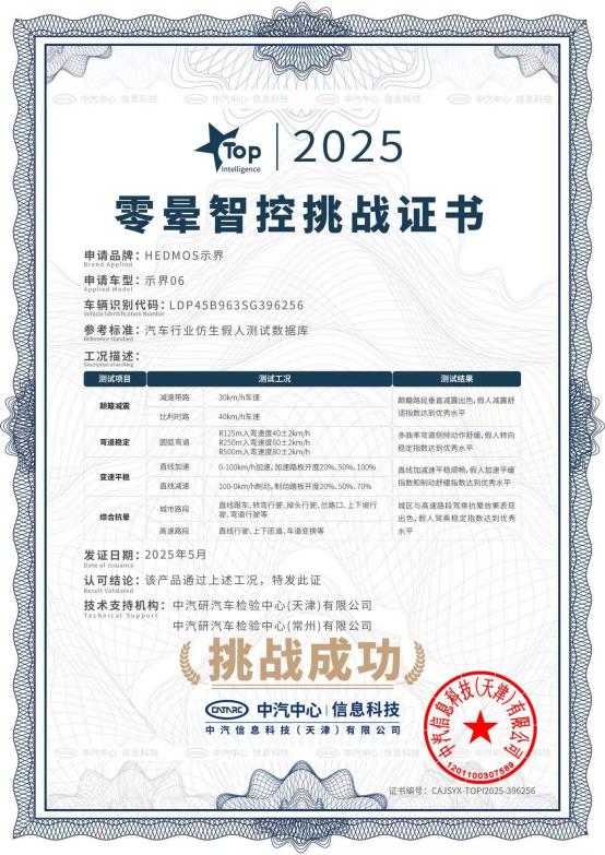 近期,在行業(yè)首次的暈動仿生假人零暈智控挑戰(zhàn)中,示界06展現(xiàn)了優(yōu)異的駕控表現(xiàn)。中國汽車研究中心有限公司高級工程師趙博文在發(fā)布會現(xiàn)場公布測試數(shù)據(jù)時指出:“通過精準(zhǔn)的電機扭矩動態(tài)分配、法系底盤調(diào)?;?,以及搭載的‘零暈智控’技術(shù)體系,示界06在六維駕控測試中表現(xiàn)出行業(yè)優(yōu)秀水平?!睖y試結(jié)果顯示,示界06完美實現(xiàn)了“6不”卓越體驗:簸路不顛、彎道不飄、加速不竄、減速不抖、駕乘不暈、長途不累,為行業(yè)樹立了駕乘舒適新標(biāo)桿。