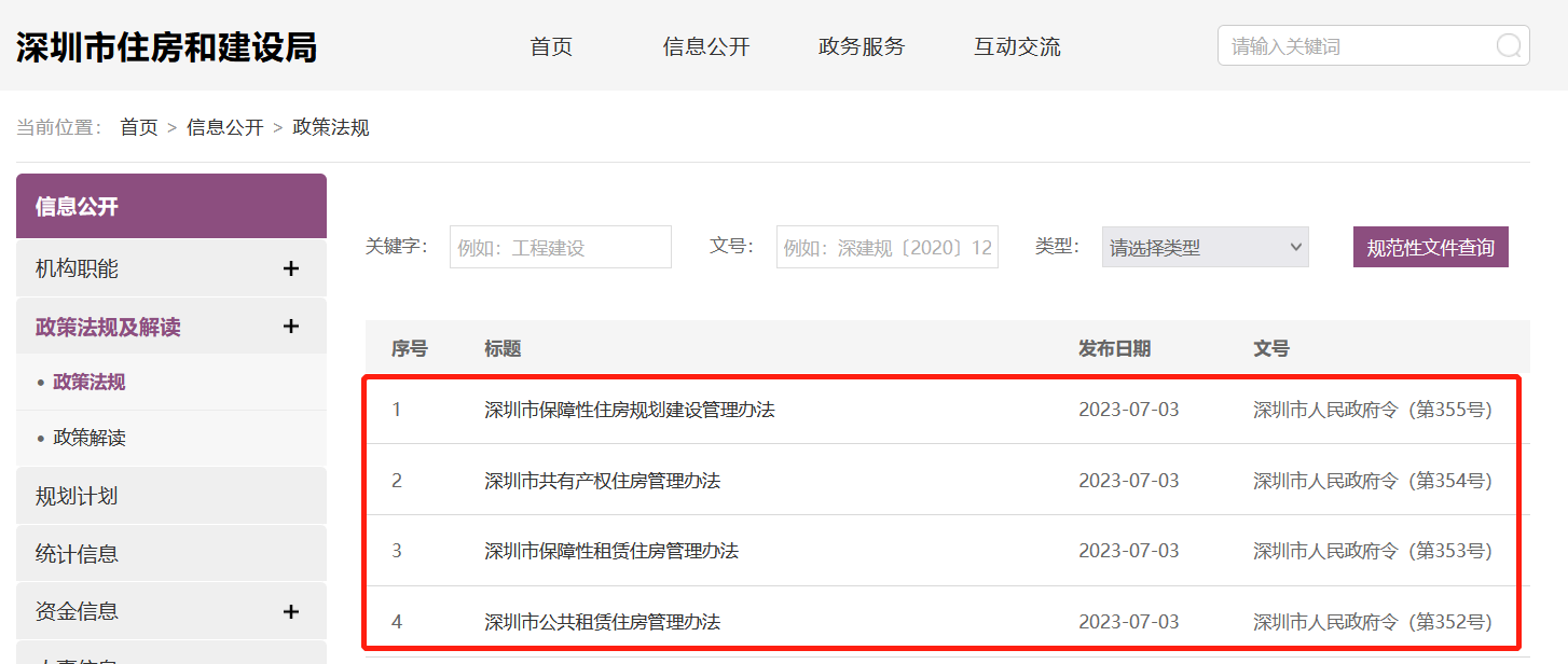 央廣網(wǎng)北京7月5日消息 據(jù)深圳市住房和建設(shè)局網(wǎng)站消息,7月3日,深圳市住建局發(fā)布《深圳市公共租賃住房管理辦法》《深圳市保障性租賃住房管理辦法》《深圳市共有產(chǎn)權(quán)住房管理辦法》《深圳市保障性住房規(guī)劃建設(shè)管理辦法》,具體來(lái)看,上述四項(xiàng)管理辦法,分別對(duì)公共租賃住房、共有產(chǎn)權(quán)住房、保障性租賃住房等三類住房的保障對(duì)象、申請(qǐng)條件、供應(yīng)分配方式、租售價(jià)格標(biāo)準(zhǔn)、用地保障、建設(shè)籌集主體和渠道、建設(shè)標(biāo)準(zhǔn)、監(jiān)督管理等進(jìn)行了規(guī)范。四項(xiàng)管理辦法將于8月1日正式實(shí)施。