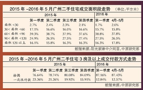 中原研究部監(jiān)測(cè)的陽(yáng)光家緣數(shù)據(jù)顯示,120平方米的物業(yè)在2016年4月~5月份成交占比較第一季度提升了1.5個(gè)百分點(diǎn),對(duì)于打算生二孩的老百姓來(lái)說(shuō),一方面,人口增多,需要提前購(gòu)置大房;另一方面,在低利率的時(shí)代,買房不僅可以使資產(chǎn)保值增值,對(duì)抗通脹,也能利用低利率政策減少購(gòu)房成本支出。在2016年成交的3房及以上的物業(yè)付款方式來(lái)看,按揭貸款的占比呈一路走高的態(tài)勢(shì),2016年1月~5月份占比在87%的水平,較2015年第三季度多了7個(gè)百分點(diǎn)左右。