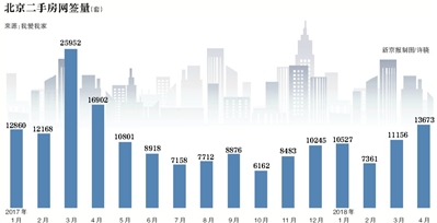 據(jù)我愛我家集團市場研究院統(tǒng)計,4月北京二手住宅共網(wǎng)簽13673套,同比2017年4月下滑19.1%,環(huán)比2018年3月上升22.6%。雖然同比仍在下降,但4月的二手房網(wǎng)簽量是去年5月至今12個月里的最高值。