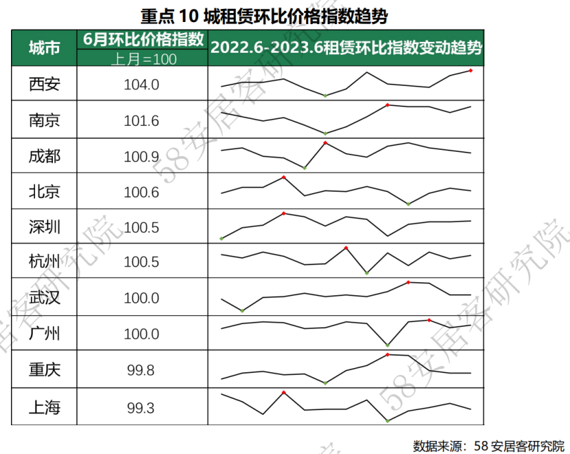 今年上半年,重點(diǎn)10城租賃市場整體呈現(xiàn)出平穩(wěn)復(fù)蘇的態(tài)勢。58同城、安居客《2023年上半年全國租賃市場報(bào)告》顯示,重點(diǎn)二線城市的價(jià)格表現(xiàn)強(qiáng)于一線城市,部分二線城市租賃價(jià)格指數(shù)保持了較好的回升趨勢,如成都、南京、武漢等城市上半年月度環(huán)比價(jià)格指數(shù)均呈現(xiàn)小幅溫和上升的趨勢。同時(shí),步入5月夏季畢業(yè)季之后,租賃市場步入旺季,北京、深圳及西安連續(xù)兩個(gè)月的環(huán)比價(jià)格指數(shù)呈現(xiàn)回升。