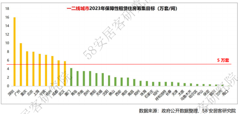從“十四五”時(shí)期城市保障性租賃住房規(guī)劃目標(biāo)來看,人口規(guī)模較大的一二線城市是保障性租賃住房的供應(yīng)主力區(qū)域。58同城、安居客整理數(shù)據(jù)顯示,其中,一線城市在整體規(guī)劃規(guī)模中占比約26.5%,二線城市占比約57.4%。同時(shí),二線城市之間的差異較大,強(qiáng)二線省會(huì)城市規(guī)劃規(guī)模在15萬套以上。今年,一二線城市保障性租賃住房籌集量占已公布城市籌集目標(biāo)總量的75.2%,核心9城2023年保障性租賃住房籌集目標(biāo)超過5萬套(間)。深圳、廣州今年的籌集目標(biāo)較高,達(dá)到10萬套(間)以上。