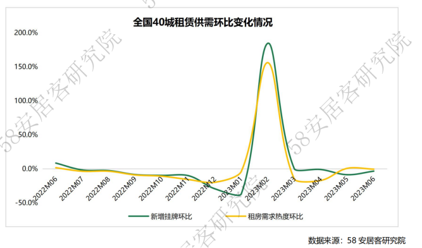 今年上半年,全國40城租賃市場供需基本處于同向波動(dòng),整體供需表現(xiàn)強(qiáng)于去年下半年。58同城、安居客《2023年上半年全國租賃市場報(bào)告》顯示,2月在春節(jié)后復(fù)產(chǎn)復(fù)工熱的帶動(dòng)下,租賃市場迎來供需兩旺的“小陽春”行情。步入二季度后,隨著市場供需在一季度的集中性釋放,租賃供需趨于回落。5月和6月,租賃市場步入傳統(tǒng)的夏季畢業(yè)求職旺季。