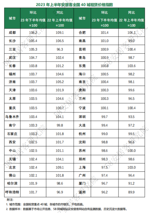 從城市價(jià)格表現(xiàn)來看,各城市間的分化差異顯著。58同城、安居客統(tǒng)計(jì)顯示,一線城市中,北京的租賃價(jià)格環(huán)比及同比均呈現(xiàn)上漲,上海、深圳和廣州較去年下半年租賃價(jià)格環(huán)比均呈現(xiàn)小幅下跌。多數(shù)二線城市租賃價(jià)格呈現(xiàn)顯著回升,如成都、長沙、武漢、福州、濟(jì)南、太原、烏魯木齊、合肥等城市價(jià)格表現(xiàn)相對(duì)較好。整體來看,2023年上半年市場普遍迎來復(fù)蘇之勢。