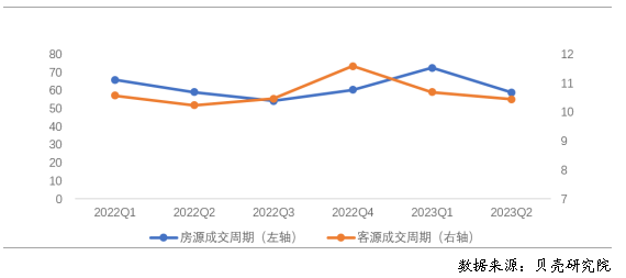 房客源活躍度提升,房屋出租周期先升后降。根據(jù)貝殼研究院數(shù)據(jù),2023年上半年重點40城新增掛牌房源量、新增帶看客戶量同比、環(huán)比均增加超過9%。房源端、客源端活躍度均保持上升的趨勢。2023年上半年重點40城房客源成交周期分別為65.0天、10.5天。相比于去年,今年上半年房源成交周期總體有所延長。從季度來看,房源供應(yīng)量的增加同時使得2023年一季度房屋出租周期比2022年四季度上升12.1天,但2023年二季度房源成交周期比一季度縮短13.6天,出房速度有所加快。從客源端來看,一、二季度客源成交周期連續(xù)縮短,顯示出租客的租房難度在降低,可選擇房源量較多,有利于租客選擇匹配自身需求的房源。