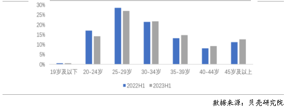 圖6 2022年上半年、2023年上半年重點40城租客年齡結(jié)構(gòu)分布
