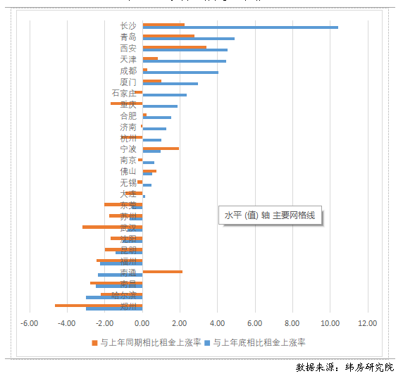 二線城市上半年住房租金漲跌參半,但多數(shù)城市未達到去年同期水平。與上年末相比,住房大數(shù)據(jù)監(jiān)測的26個二線城市中,有10個城市住房租金下降,16個城市住房租金上漲。其中,鄭州、哈爾濱、南昌等城市的住房租金降幅最大;長沙、青島、西安、天津、成都等城市漲幅在4%以上。