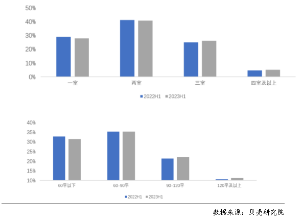 上半年租賃成交中兩居室、60-90平米房源占比最高。根據(jù)貝殼研究院數(shù)據(jù),2023年上半年重點40城兩居室成交占比最高,占比40.8%,其次為一居室,占比27.9%;租賃成交中面積段為60-90平米的占比達到35.2%,其次為60平米以下,占比為31.5%。對比去年同期,2023年上半年租賃成交結(jié)構(gòu)相對穩(wěn)定,租客對于一居室、兩居室的小戶型租賃房源需求仍保持旺盛。一居室或60平米以下的占比略有減少,部分對一居室有需求的租客或轉(zhuǎn)向了租賃集中式長租公寓,尤其是保障性租賃住房。