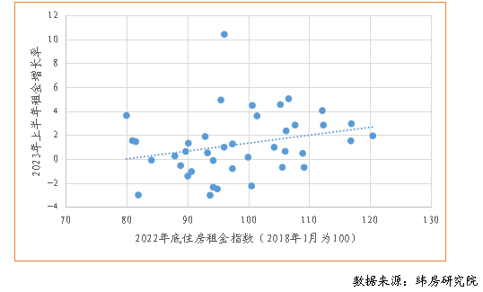 圖9 2023年上半年重點40城住房租金增長率與2022年底住房租金指數(shù)關(guān)系