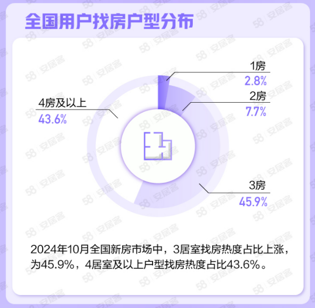 在用戶找房戶型方面,3居室仍為現(xiàn)階段熱度較高的戶型,找房熱度占比上漲,為45.9%,4居室及以上戶型找房熱度占比43.6%。張波分析稱,改善潛在需求入場(chǎng)的趨勢(shì)表現(xiàn)明顯,10月全國(guó)購(gòu)房群體中三、四房的需求占比持續(xù)提升,二手房交易稅費(fèi)的減免加之利率下行,是推動(dòng)改善需求積極入市的組合性政策效果表現(xiàn)。