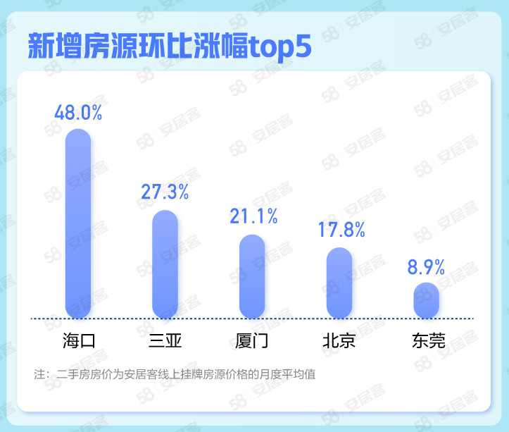 在新增供應(yīng)方面,10月全國(guó)65城新增掛牌房源量環(huán)比下跌4.1%。全國(guó)新增掛牌量房源環(huán)比上漲的前三名城市分別是???、三亞、廈門,分別上漲48%、27.3%、21.1%。