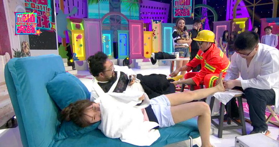 更悲慘的還在后面等著修睿。原地做造型自拍都困難無(wú)比,身子完全掌握不到平衡,直接踹翻道具椅,颶風(fēng)碉堡更是變成一座阻擋他前進(jìn)的大山,一步兩步往前跳,努力自拍擺造型,無(wú)奈實(shí)在抵擋不住勁風(fēng),直接單膝跪地整個(gè)人撲倒。和美女體驗(yàn)情景自拍,抽到“撲倒與被撲倒”,被搭檔嫌棄還要忍受撓腳心的煎熬,拍出驚悚照被張大大、小甜甜一陣暴風(fēng)吐槽。而喬杉則和一貫的老搭檔小甜甜再度演繹情景,兩人同吃小香腸自拍,一邊喬杉被撓腳心哭笑不得,氣得搶下按摩器直敲“按摩師”。