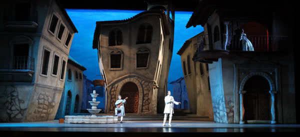 7月13日當(dāng)晚,隨著歌劇指揮莫蘭迪引領(lǐng)國家大劇院管弦樂團(tuán)奏出《塞維利亞理發(fā)師》膾炙人口的序曲旋律,大幕拉開,由著名舞臺設(shè)計(jì)師張武設(shè)計(jì)的“高迪建筑風(fēng)格”的塞維利亞小鎮(zhèn)展現(xiàn)在觀眾面前。