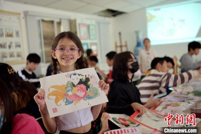 當(dāng)?shù)貢r(shí)間9月10日,天津楊柳青木版年畫博物館、巴西圣保羅華僑天主堂中文學(xué)校聯(lián)合舉辦年畫傳承研習(xí)活動。圖為一位巴西小學(xué)生展示她的年畫涂色作品。中新社記者 林春茵 攝