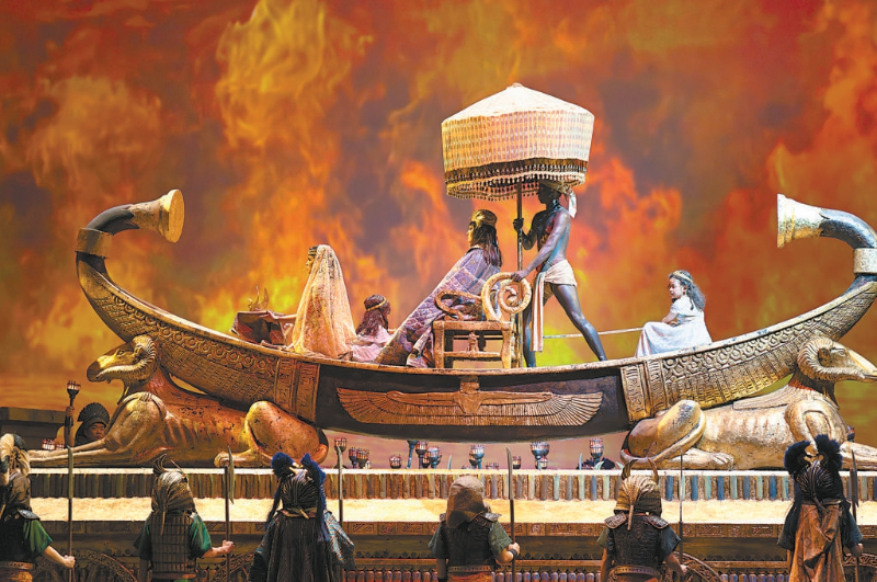 第一幕中,巍峨如巨樓的大船緩緩前進(jìn),神廟赫然聳立,幾乎將歌劇院舞臺龐大的空間頂滿;