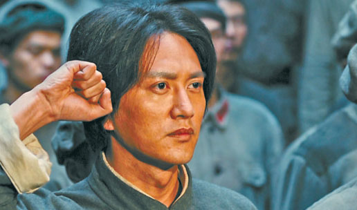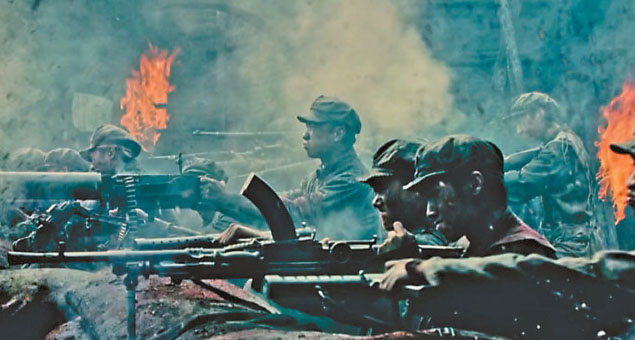 相比于以往表現(xiàn)毛澤東同志革命故事的作品,此次《浴血榮光》在如何表現(xiàn)建軍過程的影像上下了很大功夫。導演陳力做了精心設計,她讓影像不僅還原歷史,還富有更為深刻的寓意。比如,毛澤東在湖南發(fā)動秋收起義前,前往萍鄉(xiāng)安源煤礦的兵工廠,和工農(nóng)兄弟一起鍛造鐮刀與斧頭等武器,他在畫面的黃金分割點慷慨演說,鋼鐵熔爐里火紅的光芒照射在他身上,充滿油畫般的力量感和造型感,也寓意著人民軍隊就誕生于工農(nóng)中。