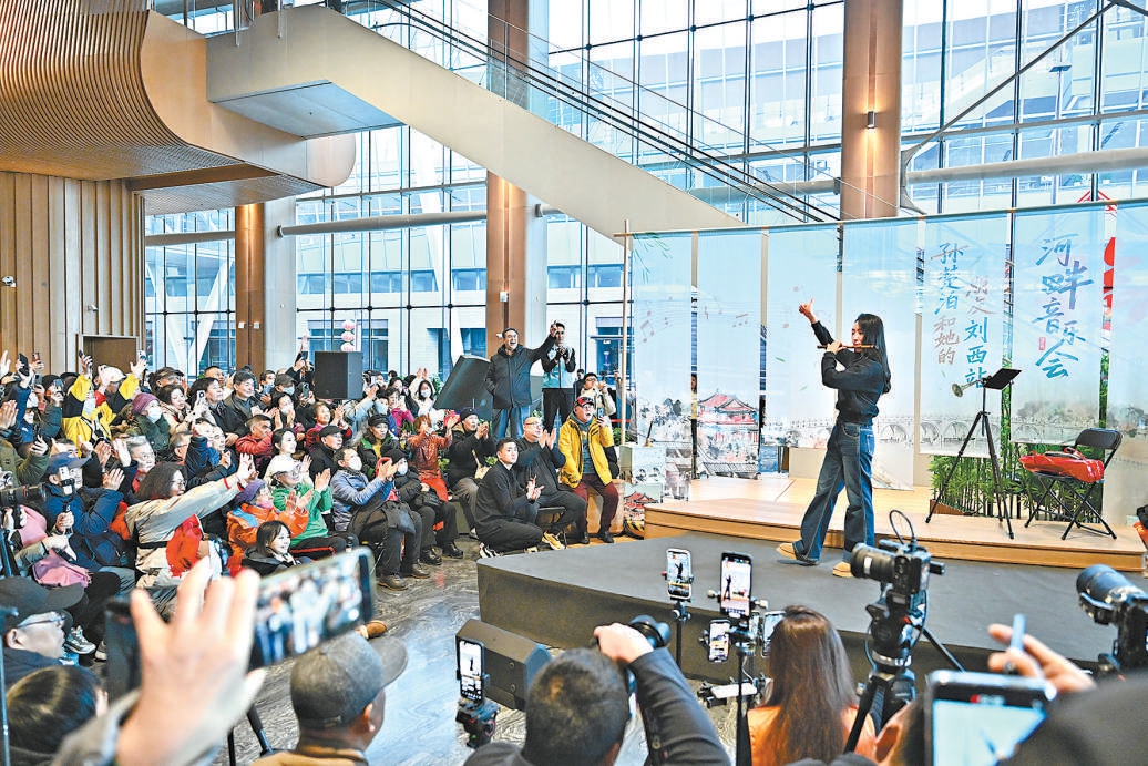 “嗩吶一響,黃金萬兩,新的一年,我給大家添添喜氣?!北本┟褡鍢穲F(tuán)嗩吶演奏員王向陽(yáng)熟練地向大家問了聲好。昨天下午,通州區(qū)遠(yuǎn)洋樂堤港行人不斷,一段《黃土情》在東區(qū)1層中庭里嘹亮吹響,很快,小舞臺(tái)前便里里外外圍了幾層人,還有不少觀眾放慢腳步,從樓上好奇地向下張望:王向陽(yáng)帶三支嗩吶上臺(tái),《百鳥朝鳳》吹得酣暢淋漓,二胡演奏員孫曉煜弓弦急動(dòng),《賽馬》氣勢(shì)奔騰,竹笛演奏員蔣錦雯用排簫吹起《月亮代表我的心》,溫柔舒展。約一個(gè)小時(shí)的演出,喝彩連連,掌聲不斷,周末時(shí)光被音樂溫暖點(diǎn)亮。