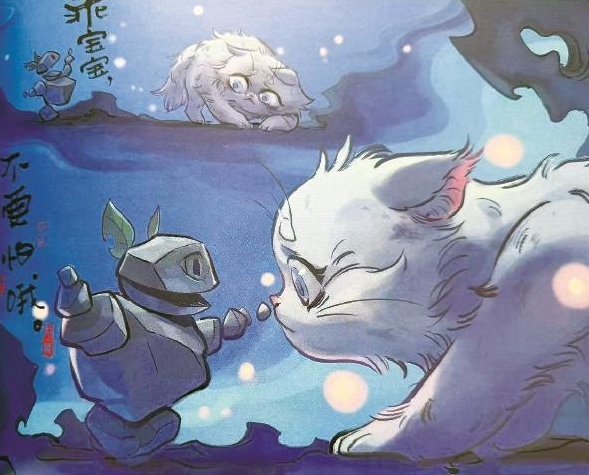 繪本故事中,石磯娘娘住的山里闖進了一只小貓咪,魔鏡告訴她高大的樣子可能會嚇到貓咪,于是她就變成小石頭人的樣子與貓咪成了好朋友(見上圖),她還給小貓咪起名叫“虎子”。有一天她和貓咪玩耍的時候碰見了一只野獸,為了保護小貓咪,她恢復(fù)了高大的樣貌嚇跑了野獸,也嚇跑了“虎子”。于是石磯娘娘又變成了孤身一人,直到有天小貓回來,告訴她自己找到了媽媽,真的要離開山里了,石磯娘娘則含淚與小貓做了正式的告別。暖心的故事看哭了很多觀眾。