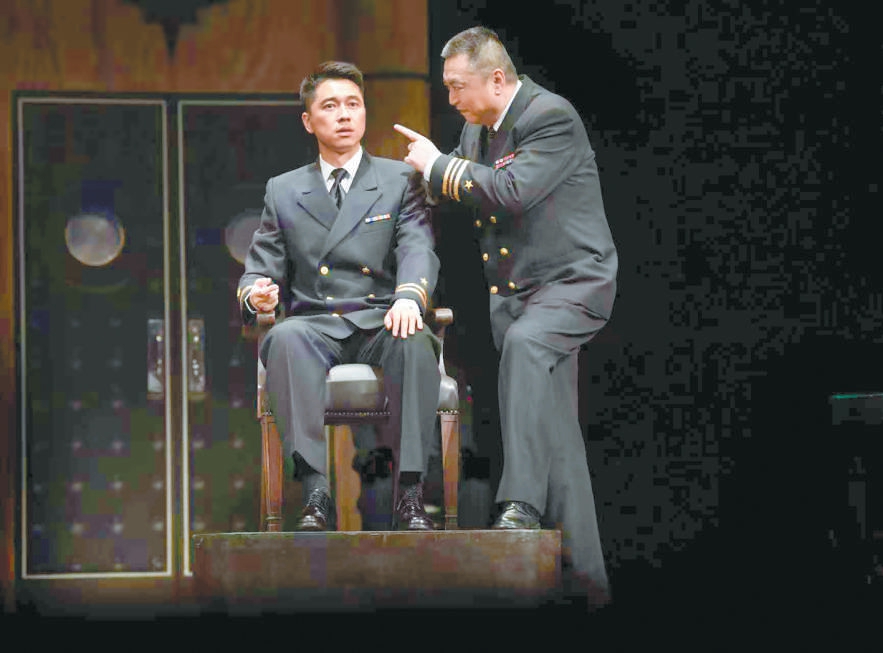 于觀眾而言,戲骨飆戲是《嘩變》格外精彩的看點(diǎn),無論是制造了“草莓事件”“黃色燃料事件”“電咖啡壺事件”等一系列“鬧劇”的艦長魁格、以“詭計”掌控全場節(jié)奏的律師格林渥,還是圖窮匕見、老謀深算的基弗,抑或每一個各懷目的、性格鮮明的角色,他們之間起伏有致的銜接是對演員表演功底的極大考驗。飾演魁格的馮遠(yuǎn)征把《嘩變》總結(jié)為一場“坐著把戲演好”的挑戰(zhàn),全劇除了格林渥與檢察官可以走動,其他所有人幾乎坐著演完全程,如何把臺詞說得詳細(xì)、說得抓人,同時靠說就把角色塑造到位,是演員需要日日精進(jìn)的功課,也是觀眾愿意一再為之奔赴而來的重要理由。