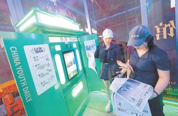 “時光照相館”自拍體驗區(qū)里,觀眾可生成以自拍照為頭版新聞的“人藝之友報”。北京日報記者 方非攝