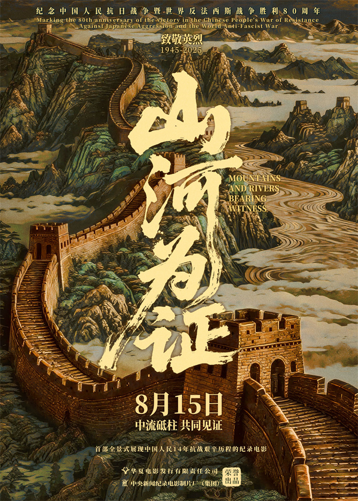 在紀念中國人民抗日戰(zhàn)爭暨世界反法西斯戰(zhàn)爭勝利80周年的重要歷史時刻,紀錄電影《山河為證》正式宣布定檔,將于2025年8月15日登陸全國院線。影片由華夏電影發(fā)行有限責任公司與中央新聞紀錄電影制片廠(集團)出品,同步發(fā)布定檔版海報。 中國人民十四年抗戰(zhàn)全景式銀幕呈現(xiàn) 近期,紀念中國人民抗日戰(zhàn)爭暨世界反法西斯戰(zhàn)爭勝利80周年重點電影《山河為證》在國務院新聞辦公室舉行的新聞發(fā)布會上獲得正式推介。這部紀錄電影首次全景式展現(xiàn)中國人民14年抗戰(zhàn)艱辛歷程,影片所凝聚的強烈情感力量,以及對抗日戰(zhàn)爭英雄群像的真實記錄,構(gòu)筑起一幅關(guān)乎民族命運的救亡圖存史,并呈現(xiàn)在當代觀眾面前。創(chuàng)作上,《山河為證》秉承嚴肅的史學態(tài)度與高度的藝術(shù)責任,既注重歷史邏輯的清晰性,也強調(diào)民族精神的傳承性。在海量珍貴影像資料基礎上,主創(chuàng)團隊運用數(shù)字修復與藝術(shù)再造相結(jié)合的方式,從塵封檔案中喚醒時代記憶,為觀眾重現(xiàn)中華民族全民抗戰(zhàn)、熱血激蕩的歷史瞬間。畫面中的每一幀,都是鐵證如山的記憶;聲音中的每一次吶喊,都是不可磨滅的見證。 定檔海報凝練民族記憶,昭示信仰力量 同步發(fā)布的定檔海報,以極具視覺沖擊力的“新國風”美學,構(gòu)建起一幅莊嚴而震撼的紀念圖景。整幅畫面融合國畫山水與銅雕藝術(shù)質(zhì)感,雄渾壯闊的萬里長城自畫面底部蜿蜒而上,貫穿山河,宛如一條鋼鐵脊梁,守護著民族的精神高地;母親河黃河奔流其間,松柏挺立其側(cè),共同鑄就中華民族“銅墻鐵壁、山河永固”的象征意象。片名“山河為證”位于海報正中,銘刻著歷史的莊重誓言,蒼勁有力的書法線條融入奔涌山河的宏大圖景,象征著民族精神的脈動與大地記憶的延續(xù)。