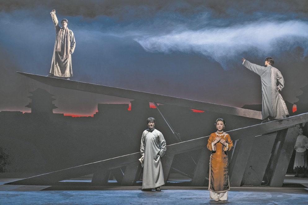 大型原創(chuàng)黃梅戲《延年和喬年》從安慶來(lái)到上海,用延喬兄弟二人的家鄉(xiāng)戲向他們致敬。圖為劇照。(演出方供圖)