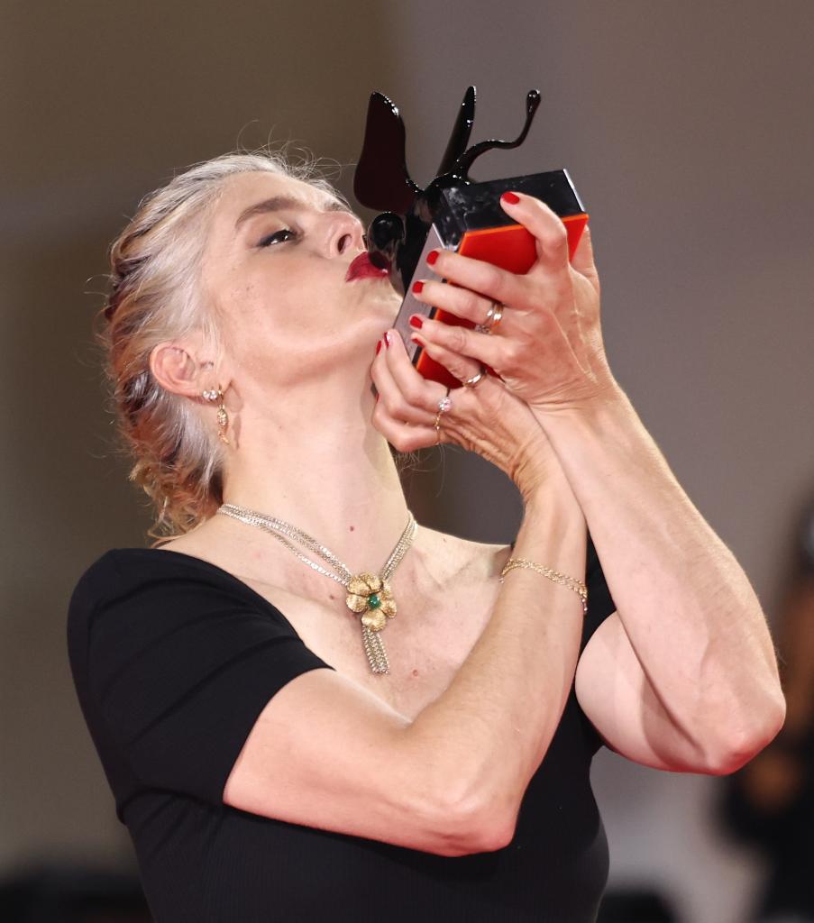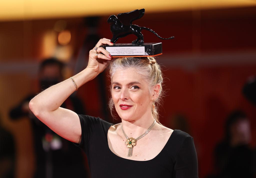 9月6日,在意大利威尼斯,最佳劇本獎獲得者、電影《執(zhí)筆》導演瓦萊麗·唐澤利與獎杯合影。新華社記者 李京 攝