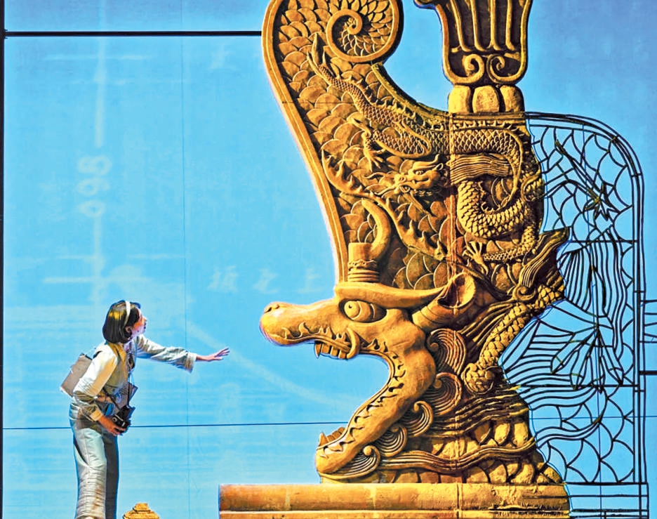 王琛透露,舞臺(tái)上關(guān)鍵的古建筑構(gòu)件均嚴(yán)格按照1∶1的真實(shí)比例復(fù)原制作,當(dāng)它們懸置于觀眾面前,一種視覺上的“沖擊力”油然而生,“觀眾能直觀體會(huì)到劇中人物每日工作的物理尺度和精神重量,體會(huì)測繪隊(duì)員是以怎樣的血肉之軀攀爬、丈量并挽留這份巍峨的文明?!蔽枧_(tái)地面,北平時(shí)期中軸線的建筑脈絡(luò)化為起伏線條,如紙張般弧形掀起,“寓意著古城文明在戰(zhàn)火中飄搖欲飛卻又根基深植的命運(yùn)。建筑的‘實(shí)’代表文明遺產(chǎn),圖紙的‘虛’代表傳承意志,虛實(shí)明暗的銜接過渡,共同凝固了那段驚心動(dòng)魄的歷史?!保ㄓ浾?高倩)
