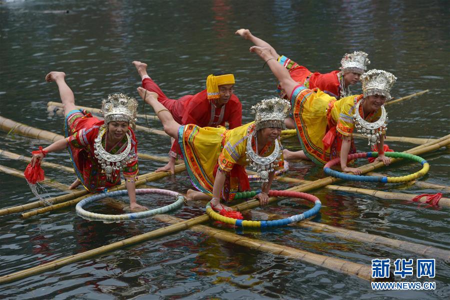 1月1日,“獨竹漂”愛好者在花溪河上表演水上高難度平衡動作。 2016年元旦,在貴陽市花溪公園平橋河段舉行的貴陽市第31屆冬泳表演活動中,數(shù)十名“獨竹漂”愛好者在花溪河上腳踏漂浮的竹竿,表演“金雞獨立”、轉(zhuǎn)身平衡等高難度動作,讓觀眾大飽眼福。新華社發(fā)(秦剛 攝)