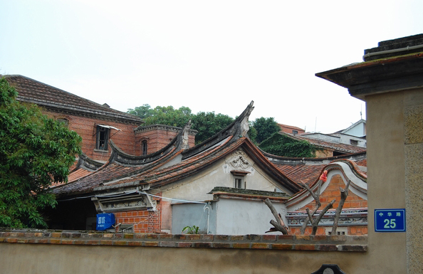 在大量的華僑洋樓建設(shè)中,體現(xiàn)出一些新風尚:一方面,立面上采用紅磚墻與少量白色線條對比的手法蔚然成風,延續(xù)了閩南紅磚厝紅磚白石的裝飾傳統(tǒng);另一方面,以裝飾藝術(shù)風格為代表的裝飾元素逐漸流行,并融合常見的傳統(tǒng)裝飾題材及西方古典裝飾元素。