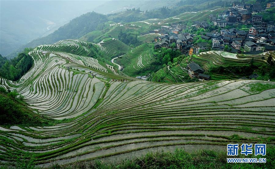 如今,梯田不僅是生存的載體,更已經(jīng)成為一種獨(dú)特的旅游資源,被稱為“地球上最美的曲線”。尤其春天,站在山頂放眼望去,形狀各異的大小梯田盛滿清泉,縱橫交錯(cuò)的田埂如蛛絲一般,農(nóng)民們犁田、砌埂、削壁、灌水, 一個(gè)個(gè)身影點(diǎn)綴在如鏡般的梯田水面上,構(gòu)成了一幅秀麗壯觀、生機(jī)盎然的田園山水畫(huà)卷。