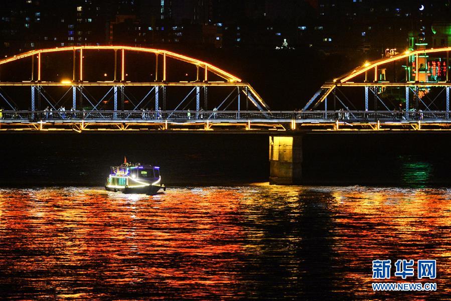 6月14日,一艘游輪從黃河蘭州段中山橋下穿過。自6月12日起,蘭州黃河游輪夏季夜航航線正式開通。據(jù)了解,作為黃河蘭州段水上旅游重點(diǎn)線路,該航線由蘭州市城關(guān)區(qū)蘭州港碼頭和白塔山碼頭始發(fā),每晚20時(shí)起開行,全程約6公里,運(yùn)行時(shí)長(zhǎng)50分鐘左右。游客可以乘坐豪華游輪欣賞黃河夜景,感受蘭州黃河風(fēng)情線別樣魅力。新華社記者 陳斌 攝
