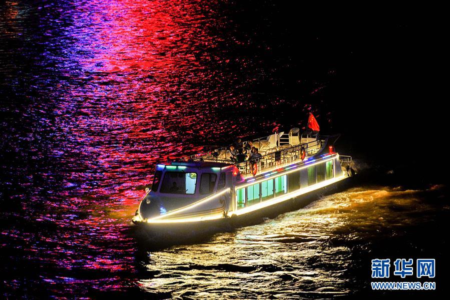6月14日,一艘游輪從黃河蘭州段中山橋下穿過。自6月12日起,蘭州黃河游輪夏季夜航航線正式開通。據(jù)了解,作為黃河蘭州段水上旅游重點(diǎn)線路,該航線由蘭州市城關(guān)區(qū)蘭州港碼頭和白塔山碼頭始發(fā),每晚20時(shí)起開行,全程約6公里,運(yùn)行時(shí)長(zhǎng)50分鐘左右。游客可以乘坐豪華游輪欣賞黃河夜景,感受蘭州黃河風(fēng)情線別樣魅力。新華社記者 陳斌 攝