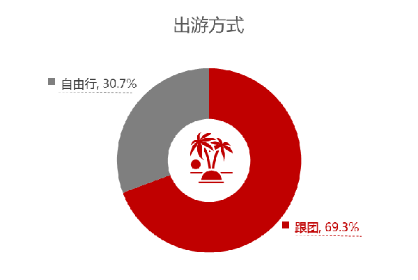 出游方式方面,跟團(tuán)游為主要的出游方式,占比60.8%,自由行占比33.2%,目的地參團(tuán)占比6%。