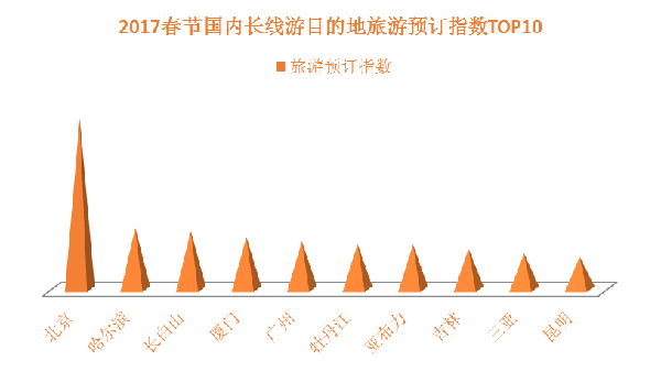 一般情況下,春節(jié)期間的國(guó)內(nèi)長(zhǎng)線游(行程3日以上,居住地300公里外)需求的出游人數(shù)在總體長(zhǎng)線游需求中占比最大?!秷?bào)告》數(shù)據(jù)顯示,北京、哈爾濱、長(zhǎng)白山、廈門、廣州、牡丹江、亞布力、吉林、三亞、昆明是2017年春節(jié)期間最熱門的十個(gè)目的地(以《報(bào)告》發(fā)布時(shí)的線路預(yù)訂數(shù)據(jù)統(tǒng)計(jì)),其中哈爾濱、長(zhǎng)白山、牡丹江、亞布力、吉林五個(gè)目的地全部來自東北地區(qū),春節(jié)期間冰雪游線路的火爆是它們上榜的共同原因,廈門、三亞、昆明等則為黃金周國(guó)內(nèi)游傳統(tǒng)熱門目的地。另外,不同城市居民春節(jié)國(guó)內(nèi)長(zhǎng)線游的目的地偏好略有差異,例如,北京最受歡迎的春節(jié)國(guó)內(nèi)游目的地主要有廣州、珠海、哈爾濱、長(zhǎng)白山,上海最受歡迎的春節(jié)國(guó)內(nèi)游目的地主要有長(zhǎng)白山、北海、三亞、北京等,廣州最受歡迎的春節(jié)國(guó)內(nèi)游目的地主要有貴陽(yáng)、張家界等。